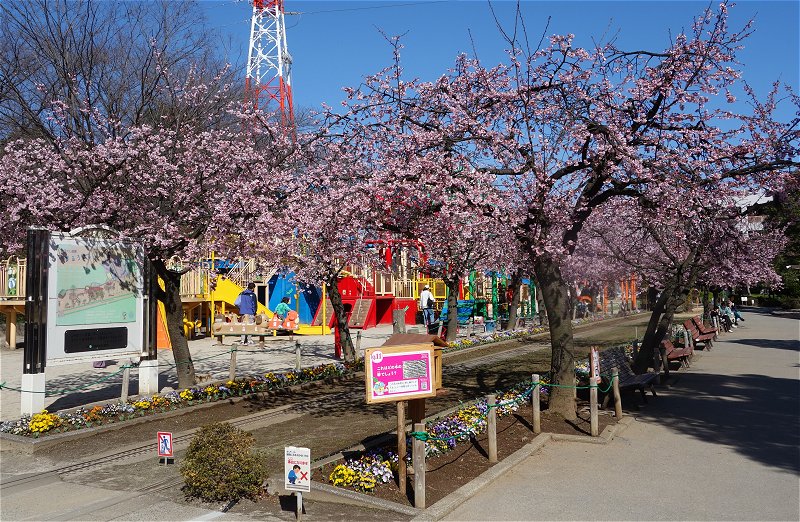 今の時期にミニ鉄道に乗ると、桜のアーチの下を走る体験ができます。